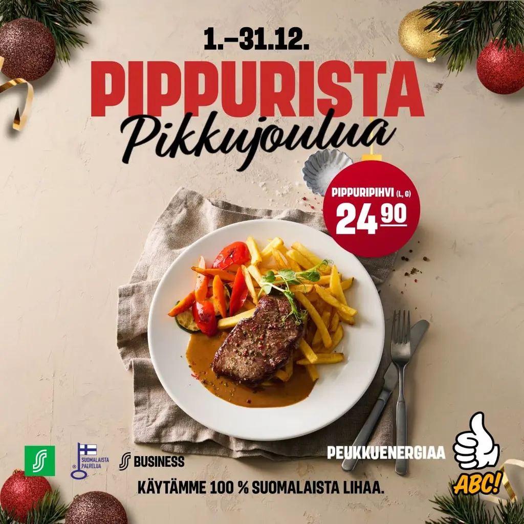 Kotimainen pippuripihvi joulukuun kampanjassa ABC Ravintoloissa 1.–31.12.2024 ♥️Joulukuussa herkutellaan 100 % hyvin. Joulukuun ajan Eekoon ABC Ravintoloissa pääsee nauttimaan pippuripihvillä hintaan 24,90 €. Mehevän kotimaisen naudanlihapihvin lisukkeena on lämpimiä kasviksia ja rapeita maalaisranskalaisia, jotka vievät kielen kerta kaikkiaan mennessään.Kerää työkaverit, perhe ja ystävät kokoon ja suuntaa suorinta tietä joulukauden pippurisimmalle aterialle.