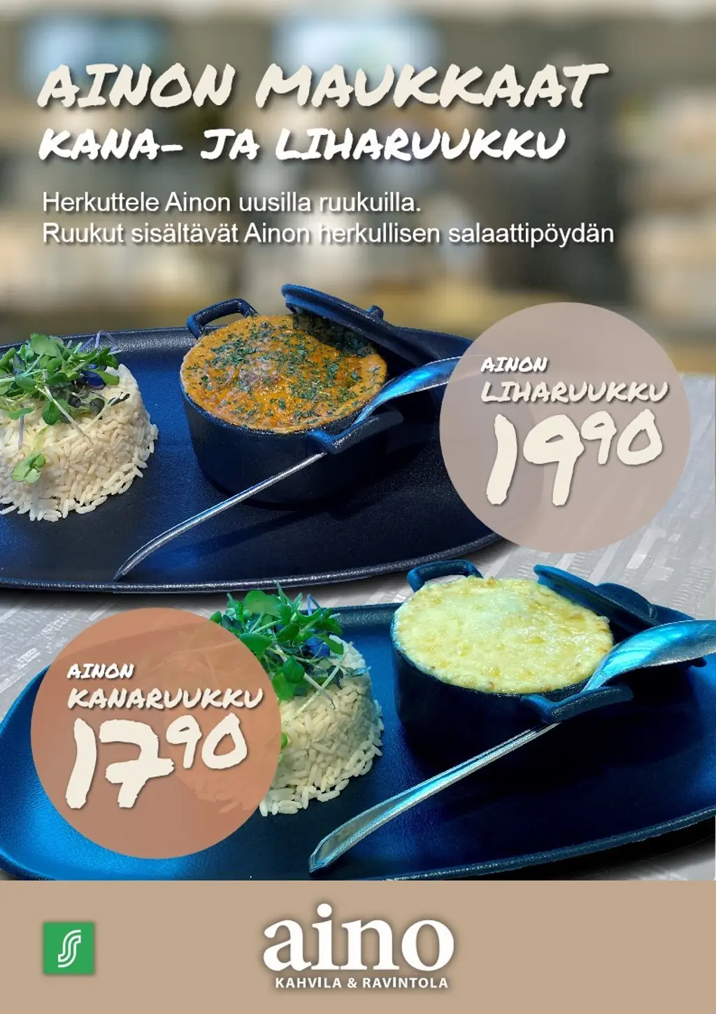 Nyt on aika herkutella! Imatran Ainossa on tarjolla rakastetut kana- ja liharuukut, jotka lämmittävät niin mieltä kuin makuhermoja.- Kanaruukku (17,90 €) – Mehevä ja mausteinen kanaruukku, joka tarjoillaan höyryävän riisin ja herkullisen kastikkeen kera.