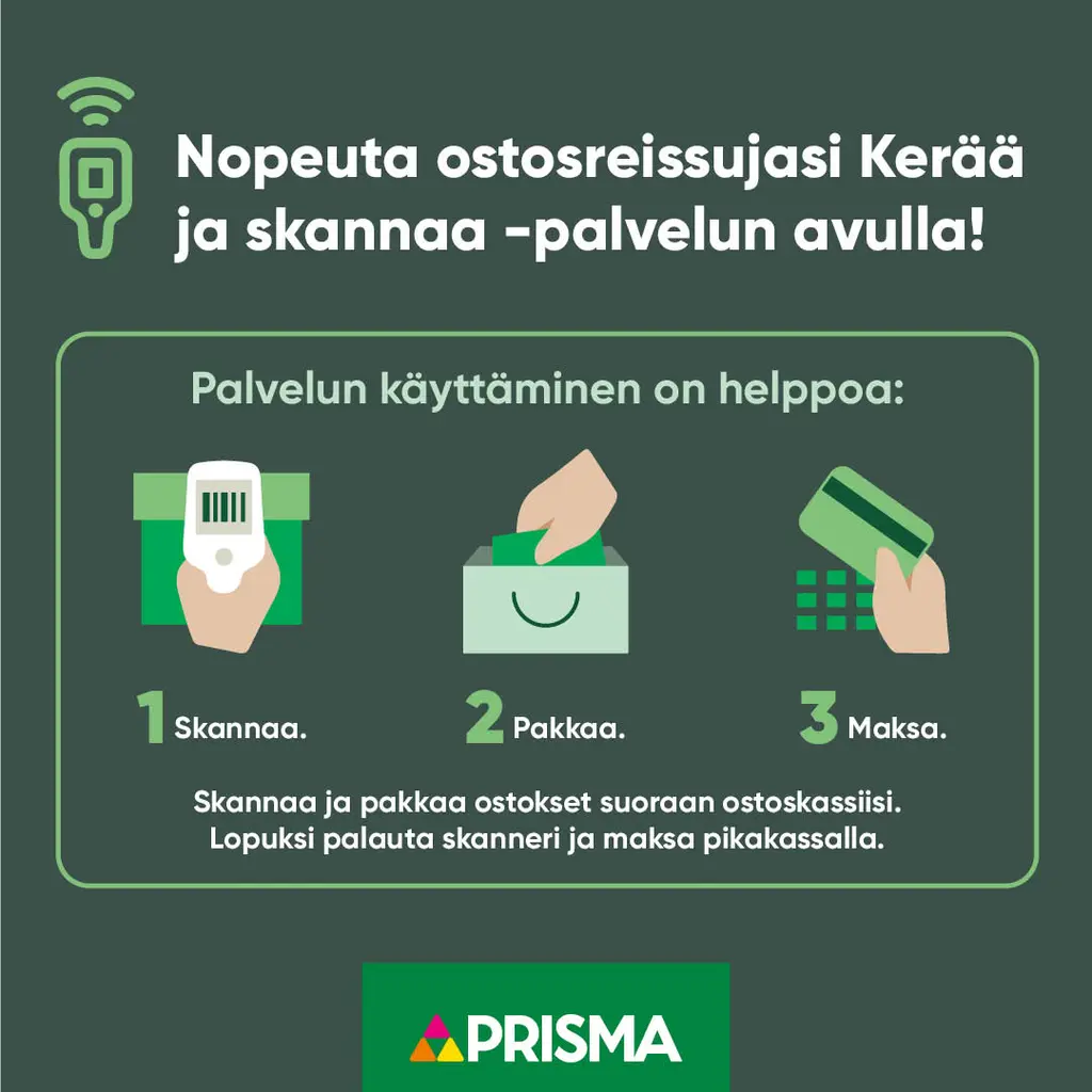 Loppuviikon ajan Lappeenrannan Prismoissa henkilökunta on paikalla opastamassa Kerää ja skannaa -palvelun käyttöönotossa. Kaikki uudet rekisteröityjät saavat tällöin itselleen kestokassin ja iltapäivälehden veloituksetta. Imatran Prismassa vastaava kampanja toteutetaan samoilla kellonajoilla torstaista lauantaihin viikkoa myöhemmin viikolla 17.Kerää ja skannaa -palvelun käyttöönotto kannattaa, sillä se on helppoa ja nopeuttaa asioimista. Voit skannata ja pakata ostokset suoraan ostoskassiisi. Lopuksi palautat skannerin ja maksat ostokset pikakassalla. Tervetuloa kokeilemaan!