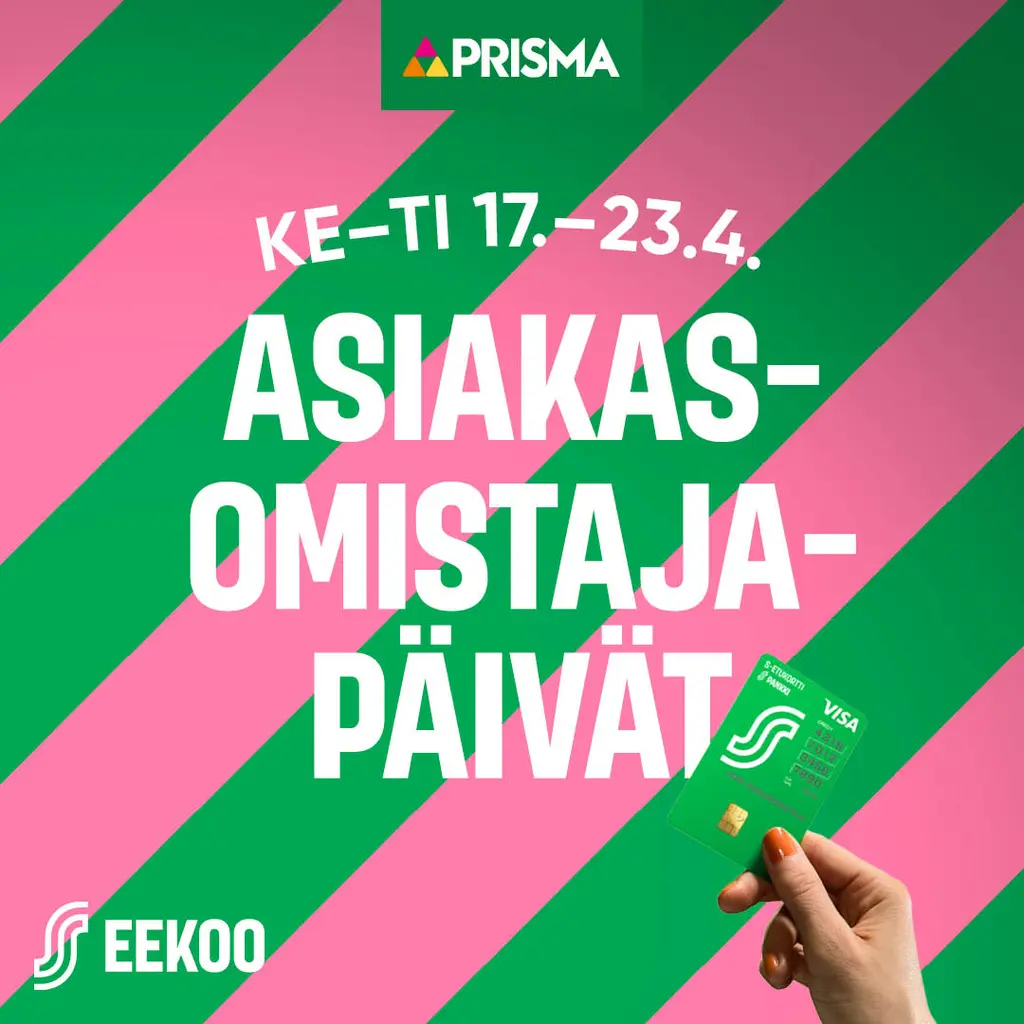 Prismojen asiakasomistajapäivät ovat taas täällä! Vuoden ensimmäisiä asiakasomistajapäiviä vietetään tällä kertaa poikkeuksellisesti keskiviikosta aina tiistaihin asti 17.–23.4.2024.Nyt on erinomainen mahdollisuus vetää vihreä ässä hihasta ja tehdä hankinnat kevääseen ja kesään Prisman laajasta käyttötavaravalikoimasta. Asiakasomistajapäivien aikaan saat alennusta käyttötavaroista jopa –15 % ja Bonusta jopa 5 %. Huomioithan, että myös Prisma Lappee on nyt ensimmäistä kertaa mukana asiakasomistajapäivissä.Tervetuloa!