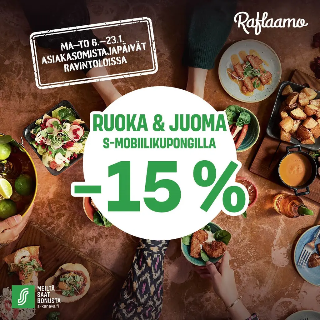 S- mobiilin etukupongilla saat alennusta ruoasta ja virvokkeista maanantaista torstaihin 23.1.2025 asti.Tarkemmat tiedot kupongista sekä ravintolat, joissa etu on voimassa löydät omasta S-mobiili sovelluksesta tai osoitteesta Raflaamo.fi: https://www.raflaamo.fi/fi/uutinen/5321-asiakasomistajapaivat-ravintoloissa-15.
