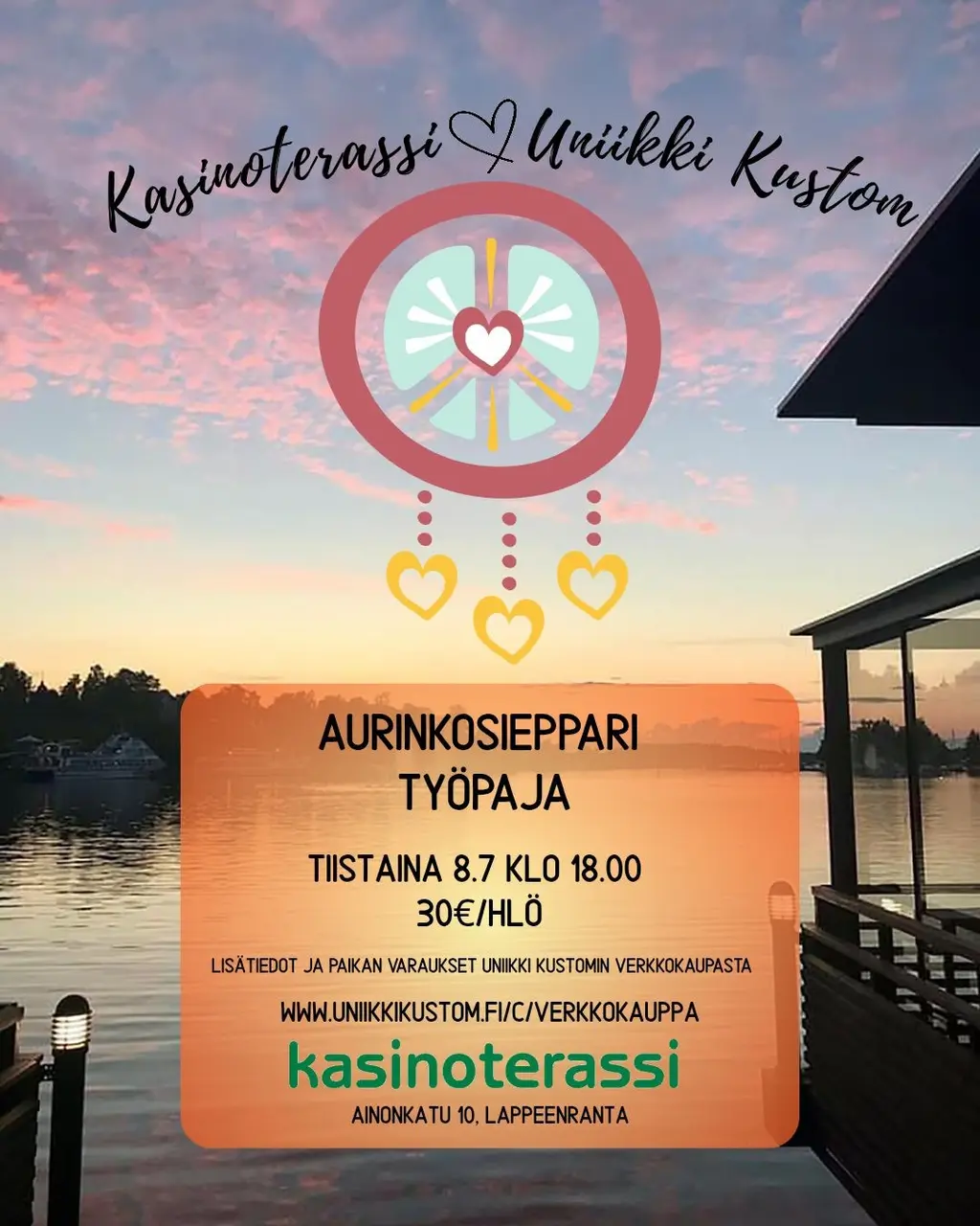 Varaa paikkasi: https://www.uniikkikustom.fi/p/8-7-2025-aurinkosieppari-tyopaja-kasinoterassillaTervetuloa taianomaiseen työpajaan kauniille Kasinoterassille, missä rakennamme uniikkeja aurinkosieppareita. Käytämme muun muassa kristalleja, helmiä, metallilankaa, vanhoja pitsinpalasia ja muita aarteita, jotka kimmeltävät auringonvalossa ja tuovat iloa niin kotiin kuin mökille.Työpaja sopii kaikentasoisille tekijöille – et tarvitse aiempaa kokemusta, vain halun luoda jotakin kaunista. Saat ohjatusti koota oman siepparisi, joka heijastaa valoa ja hyvää mieltä.Paikka: Kasinoterassi, Ainonkatu 10 LappeenrantaAika: tiistaina 8.7.2025 klo 18-20Kesto: noin 2 tuntiaHinta: 30 €/hlö – sisältää kaikki materiaalit, ohjauksen ja lempeän kesäfiiliksenPaikkoja rajoitetusti – varaa paikkasi ajoissa! Tule yksin tai ystävän kanssa, nappaa mukaan virkistävä juoma ja uppoudu hetkeksi valon ja luovuuden maailmaan.Ps. Jos on huono sää työpaja siirretään Birran kabinettiin. Tästä ilmoitetaan kaikille kaikille paikan varanneille.