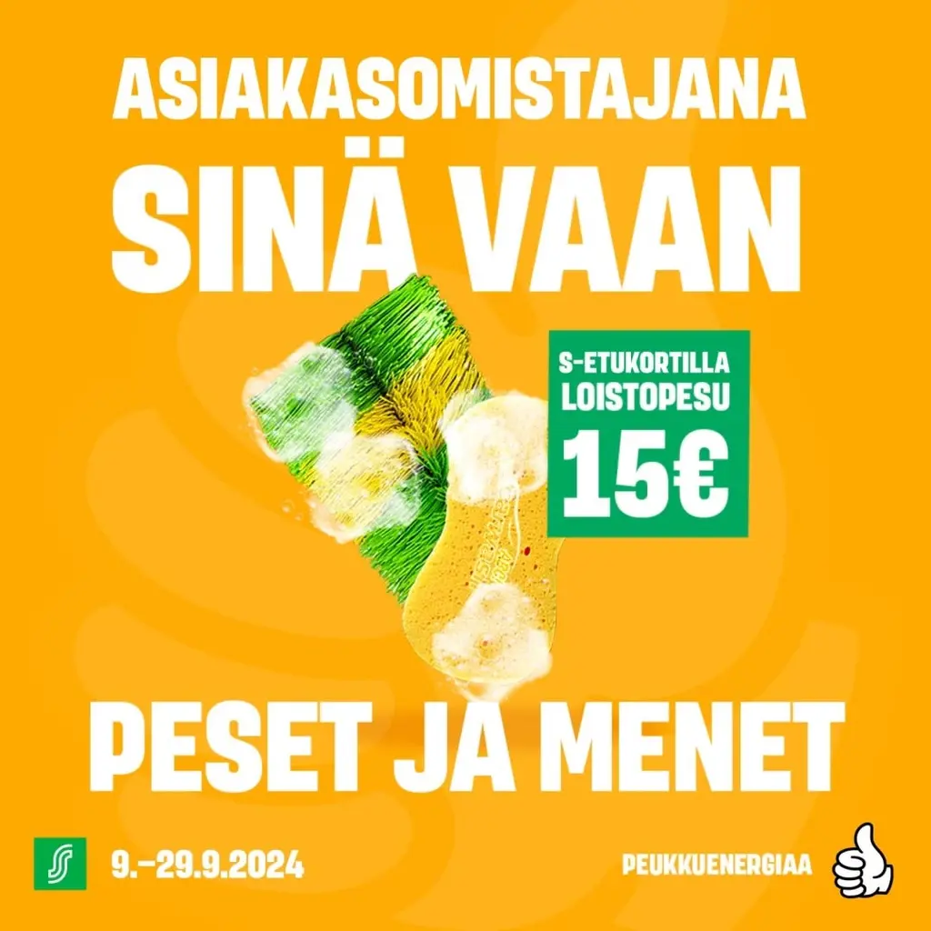 Syyskuussa on syytä pitää ABC-mobiili tai S-Etukortti käden ulottuvilla! Loistopesu on ABC:n suosituin pesuohjelma, joka puhdistaa auton kauttaaltaan ja antaa sille säältä suojaavan vahapinnan.Tarjous on voimassa Eekoon ABC Carwash –autopesuasemilla Imatralla ja Lappeessa ABC-mobiililla tai S-Etukorttia näyttämällä 9.–29.9.2024.
