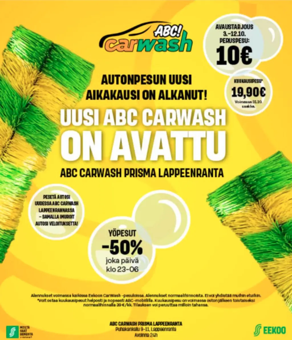 - Uusi ABC CarWash Prisma Lappeenranta tuo asiakkaillemme nykyaikaisimmat, laadukkaimmat ja ympäristöystävällisimmät autopesupalvelut helposti saataville. Olemme ylpeitä, että voimme kehittää palveluitamme vastuullisesti, kommentoi vähittäiskaupan toimialajohtaja Petteri Väyrynen.