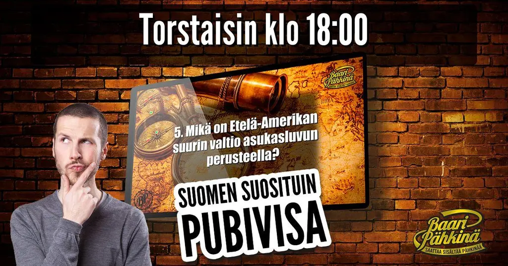 Tervetuloa Taavetin tapahtumakeidas Kanuunan suosittuihin Baaripähkinä-tietovisoihin, jotka starttaavat torstaina 12.9. klo 18 ja jatkuvat viikoittain tammikuuhun saakka!Tämä viihdyttävä ja rento pubivisailukonsepti on kerännyt mainetta ympäri Suomen ja nyt sinulla on mahdollisuus näyttää tietosi ja taitosi. Kokoa joukkueesi (1-5 henkilöä) ja tule mukaan kilpailemaan, nauttimaan hyvästä seurasta ja hauskasta tunnelmasta. Osallistuminen on täysin ilmaista, ja visa on suunnattu kaikenikäisille, kunhan täytät ravintolan ikärajan.Luvassa on monipuolisia kysymyksiä, musiikkia ja kuvia – jotain jokaiselle visailijalle.Kanuunassa järjestetään viikoittainen tietovisa, joissa kunkin viikon paras joukkue etenee kohti ravintolan omaa finaalia. Finaalissa ratkaistaan, kuka kruunataan Kanuunan mestariksi ja jatkaa kohti Baaripähkinän SM-finaalia, jossa aluefinaalien mestarit kohtaavat kerran vuodessa. Lisätietoja saat ravintolasta.