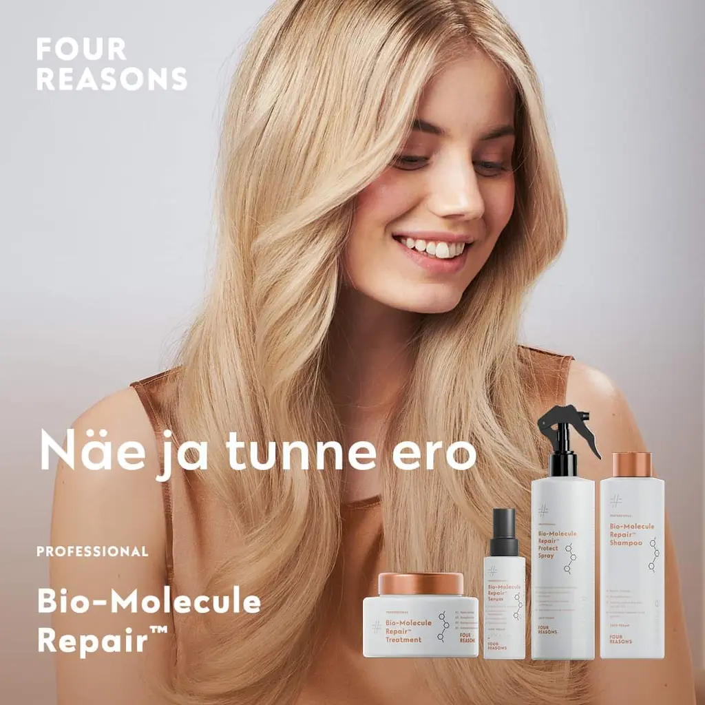 On aika suojata ja korjata hiusta teknologialla, joka huomioi hiuksen kokonaisuudessaan. Four Reasons Professional Bio-Molecule Repair™ -linjan tuotteet suojaavat, korjaavat ja ylläpitävät suomukerroksen toimintaa sekä korjaavat hiuksen sisäisiä vaurioita niin, että eron voi tuntea ja nähdä.Nyt uutuutena meillä Prisman Hiusässillä Bio-Molecule hoito muun palvelun yhteydessä tutustumishintaan vain 10€ (norm. 15 €)! Tarjous on voimassa 31.7.2024 asti. Myös kotihoitotuotteet saatavana liikkeestämme.Tervetuloa tutustumaan ja ihastumaan uuteen palveluumme!