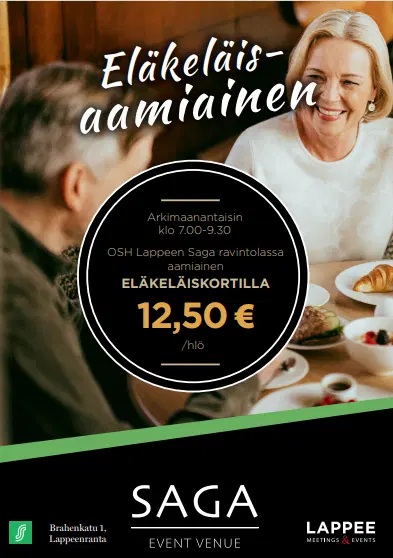 Original Sokos Hotel Lappeen Saga-ravintolassa aamiainen arkimaanantaisin klo 7.00–9.30 eläkeläiskortilla 12,50 €/hlö .