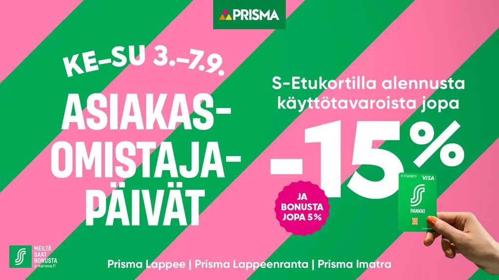 AO-päivät jälleen keskiviikosta sunnuntaihin 3.-7.9.2025Eekoon Prismoissa Lappeenrannassa ja Imatralla vietetään AO-päiviä jälleen loppuviikon ajan keskiviikosta sunnuntaihin 3.-7.9.2025.Nyt on oikea aika laittaa vihreä kortti viuhumaan ja tehdä kaikki tärkeät hankinnat syksyyn ja arkeen paluuseen. S-Etukortilla saat alennusta käyttötavaroista jopa –15% ja bonusta päälle jopa 5%. AO-päiviä vietetään tällä kertaa vain Eekoon Prismoissa, minkä vuoksi alennukset saa vain myymälässä tehdyistä ostoksista!Tervetuloa edullisille ostoksille Prismaan!