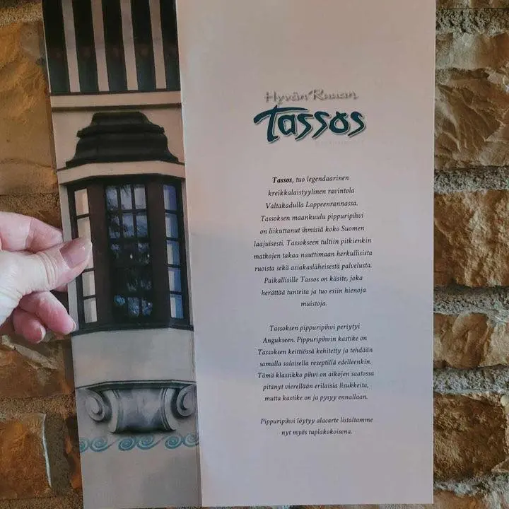 Hyvän ruoan Tassos, tuo legendaarinen kreikkalaistyyppinen ravintola Valtakadulla Lappeenrannassa, jonka maankuulu pippuripihvi on liikuttanut ihmisiä koko Suomen laajuisesti. Tassokseen tultiin pitkienkin matkojen takaa nauttimaan herkullisista ruoista sekä asiakasläheisestä palvelusta.Paikallisille Tassos on käsite, joka herättää tunteita ja tuo esiin hienoja muistoja. Tänäkin vuonna kuuntelimme teidän palautteita ja toiveita ja rakensimme menun Tassoksen legendaarisista annoksista alkuperäisin reseptein, unohtamatta a la carte listallamme jo olevaa Tassoksen legendaarista pippuripihviä.Tassoksen herkut ovat tarjolla Anguksessa syys-lokakuun ajan.