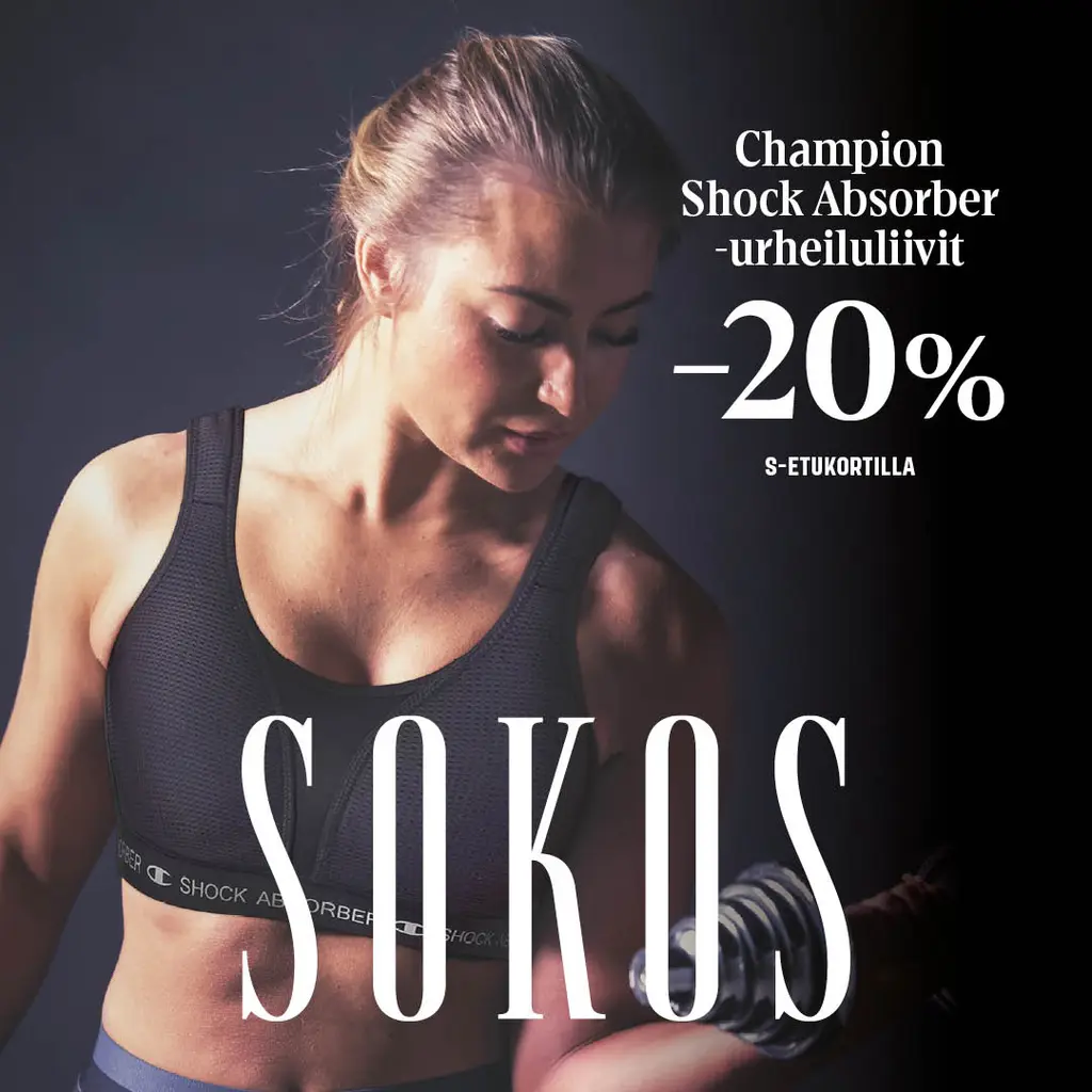 Kaikki normaalihintaiset Champion Shock Absorber -urheiluliivit –20 % S-Etukortilla Sokoksella ja verkkokaupassa sokos.fi 1.–14.9.2025.Tule perjantaina 12.9.2025 klo 13-18 mittauttamaan Sokoksen urheiluliiviklinikalle oma kokosi ja löydä itsellesi sopivat liivit asiantuntijoidemme opastuksella. Osallistu samalla arvontaan, jossa voit voittaa urheiluliivit Champion Shock Absorber -mallistosta.