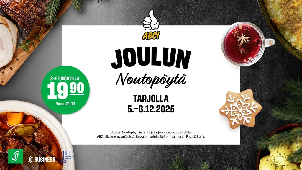 Joulun noutopöytä on tarjolla Eekoon ABC-asemilla Imatralla, Viipurinportissa ja Särkisalmella 5.–6.12.2025. Hinta S-Etukortilla 19,90 € (norm. 21,90 €)