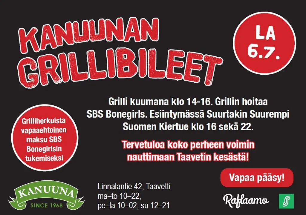 Lauantaina 6.7.2024 Kanuunassa on grilli kuumana klo 14–16. Grilliherkuista on vapaaehtoinen maksu, joka menee SBS Bonegirls -salibandyjoukkueen toiminnan tukemiseksi.Musiikista vastaa yhtye, jonka nimikään ei jätä ketään kylmäksi: Suurtakin Suurempi Suomen Kiertue, showtime klo 16 ja klo 22.Tervetuloa koko perheen voimin nauttimaan Taavetin kesästä!