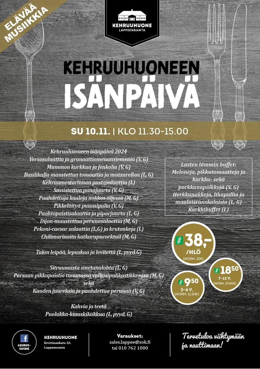 Kehruuhuoneen isänpäivälounas sunnuntaina 10.11.2024 klo 11.30–15.00