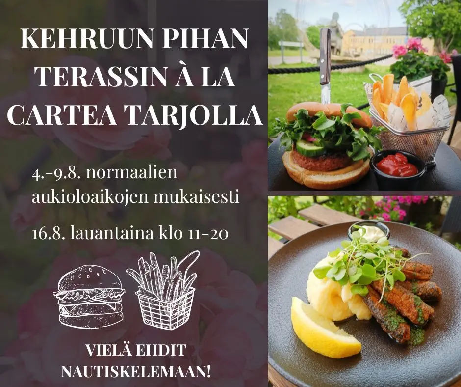 A la carte -keittiö on viimeistä kertaa avoinna tänä kesänä lauantaina 16.8.2025 klo 11–20.Kesä on kääntynyt elokuuhun ja nyt alkavat olla viimeiset hetket tulla nauttimaan Kehruun pihan a la carte -listan antimista!Kehruun pihan a la cartea on saatavilla tänä kesänä vielä:- maanantaista torstaihin 4.-7.8. klo 14-18.30
