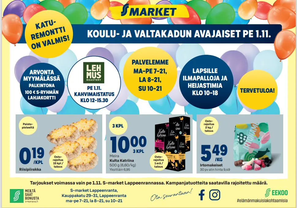 Perjantaina 1.11.2024 vietetään Koulu- ja Valtakadun avajaisia ja S-market Lappeenranta on mukana avaushulinassa.Meillä on tarjouksia, lapsille ilmapalloja ja heijastimia, arvontaa ja Lehmus Roasteryn kahvimaistatusta.Lämpimästi tervetuloa!
