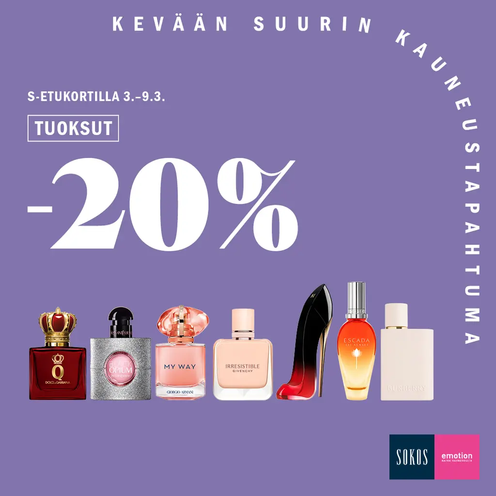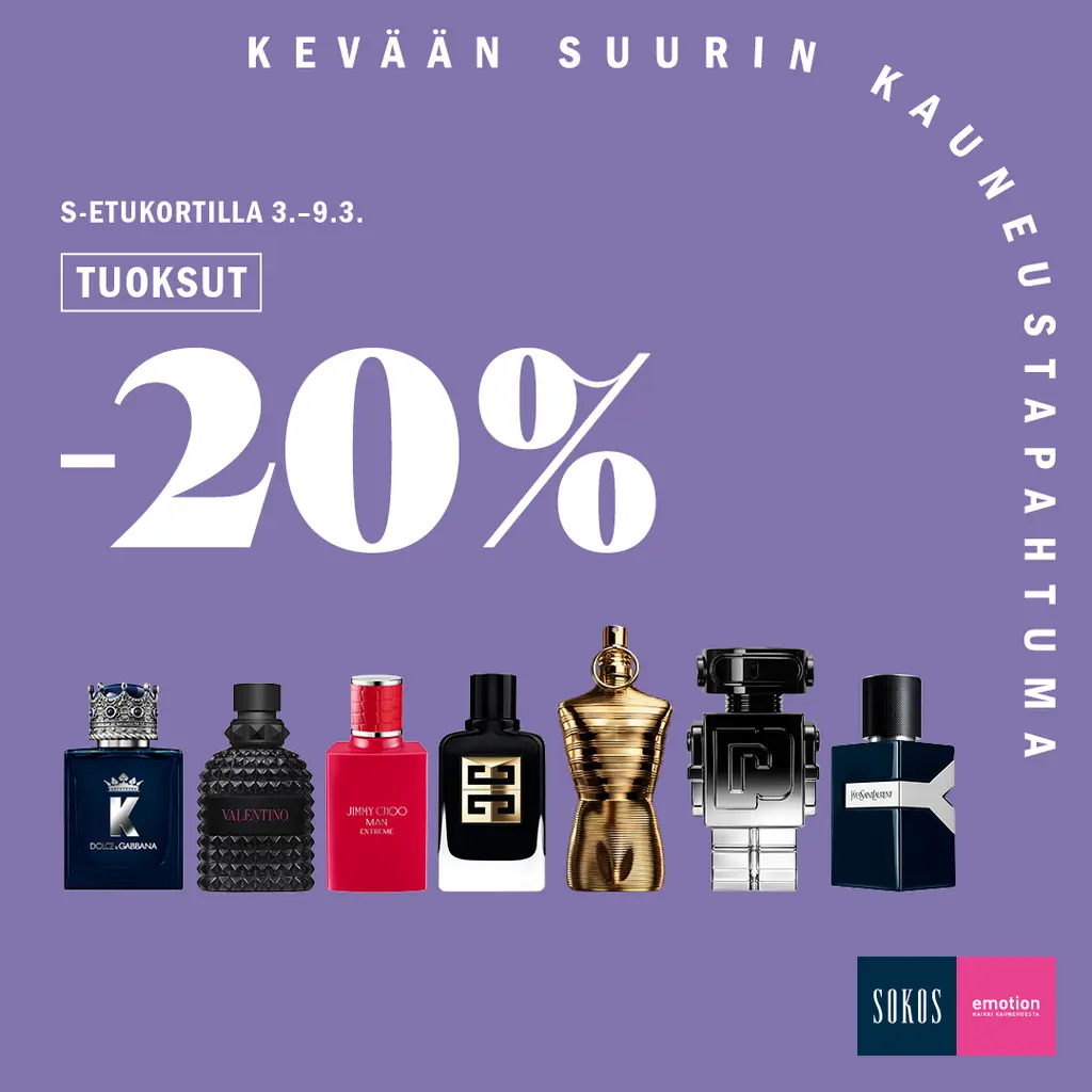 Uusi tuoksu tuo koko olemukselle viimeisen silauksen. Saat Kutsu kauneuteen -tapahtuman ajan normaalihintaiset tuoksut S-Etukortilla –20 %. Etu koskee normaalihintaisia naisten ja miesten tuoksuja. Etua ei voi yhdistää muihin tarjouksiin tai alennuksiin.Kutsu kauneuteen 3.–9.3.2025 Sokoksella sekä verkkokaupassa sokos.fi.