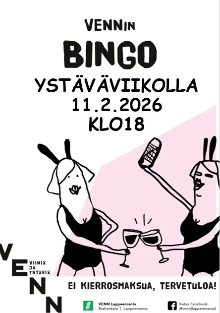 Lisäksi keskiviikkona 11.2.2026 klo 18.00 ystäväviikon bingo pyörähtää käyntiin. Bingoon vapaa pääsy! Tervetuloa!