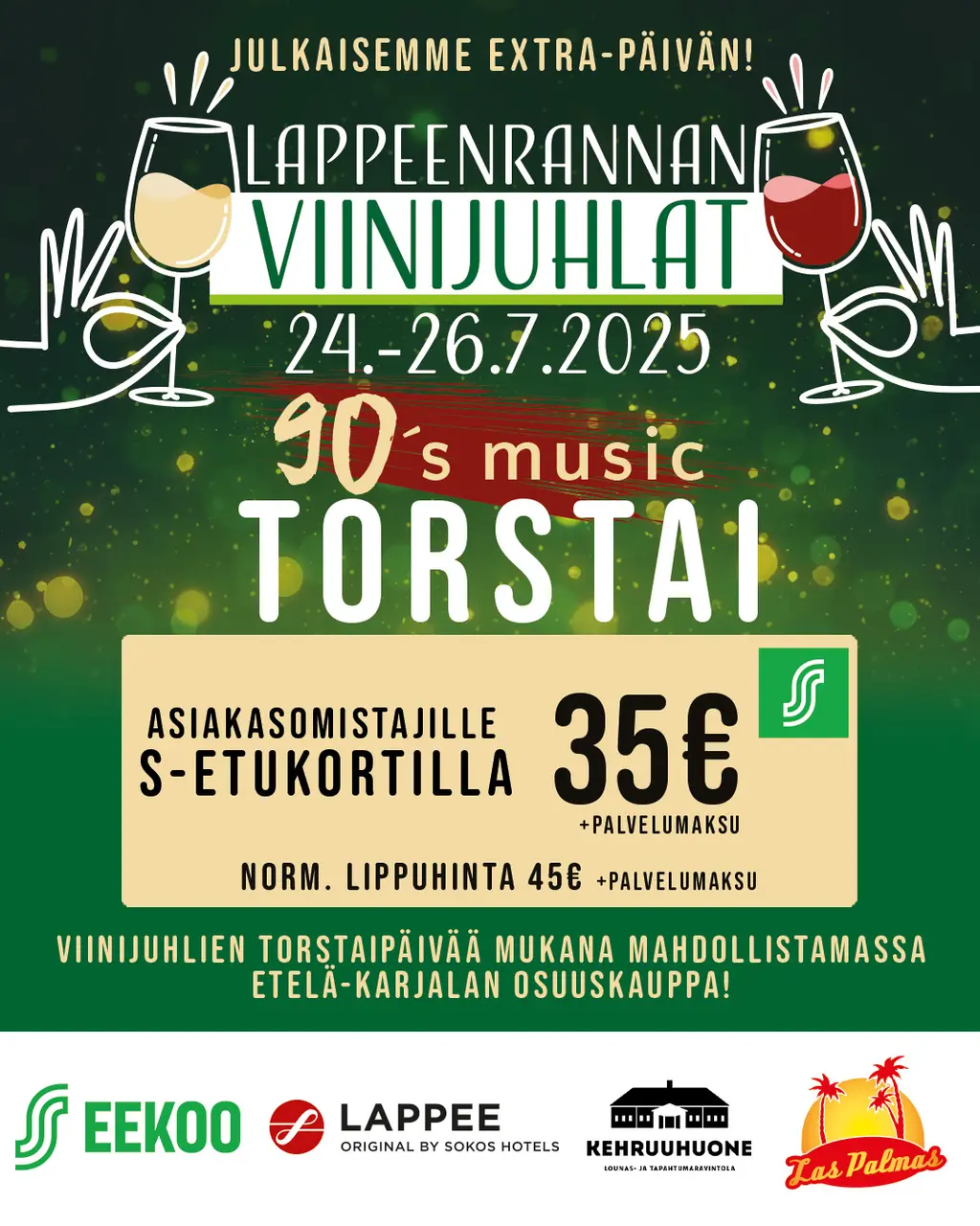 Viime vuoden hyvän vastaanoton ja tämän vuoden vilkkaana alkaneen lipunmyynnin johdosta Lappeenrannan Viinijuhlat laajenevat kolmipäiväiseksi. Lappeenrannan Viinijuhlia juhlitaan Linnoituksen Juhlateltassa tulevana kesänä 24.–26.7.2025, startti on siis jo torstaina 24.7.2025. Torstaipäivää mahdollistaa myös yhteistyökumppanuus Etelä-Karjalan Osuuskaupan kanssa.– Lappeenrannan Viinijuhlat saivat hyvän vastaanoton jo ensimmäisellä kerralla viime kesänä. Haluamme olla osaltamme mukana mahdollistamassa Lappeenrannan kesätapahtumia ja tarjoamassa etuja asiakasomistajillemme. Etelä-Karjalan Osuuskaupalla on omaa ravintolatoimintaa Linnoituksessa Kehruuhuoneella, joten yhteistyö Kattava Cateringin ja Lappeenrannan Viinijuhlien kanssa tuntuu luontevalta, kommentoi yhteistyötä Olli Järvinen, Etelä-Karjalan Osuuskaupan matkailu- ja ravitsemiskaupan toimialajohtaja.– Olemme jo pitkään tehneet monenlaista yhteistyötä Etelä-Karjalan Osuuskaupan kanssa ja nyt sen kasvattamiseen tarjoutui mahdollisuus. Saamme aidosti yhteistyöllä aikaan molempien asiakkaille merkittäviä etuja, toteaa Saku Hyttinen Kattava Cateringistä.Torstaipäivän teemana on 90`music, esiintyjinä Pandora, Aikakone, Waldo’s People ja Movetron.Tapahtuman peruslippujen kohtuulliset hinnat ovat saaneet tämän vuoden lippukaupan alkamaan aktiivisena jo joulukuussa ja liput liikkuvat hyvin. Liput ovat ostettavissa tapahtuman verkkosivuilla lappeenrannanviinijuhlat.fi.Peruslippujen hinnat