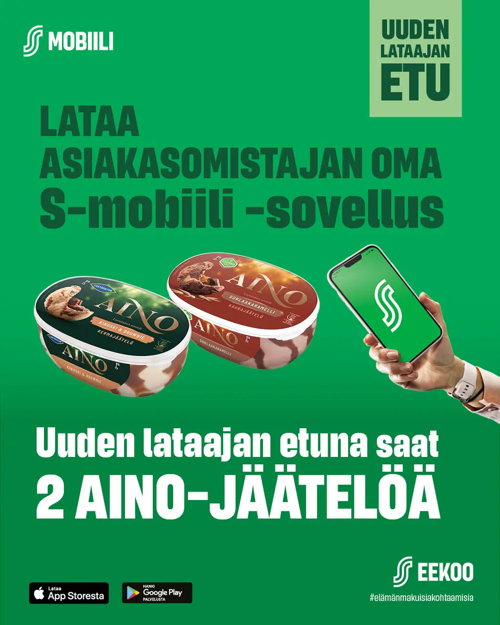 Uuden lataajan etuna saat 2 AINO-jäätelöä.