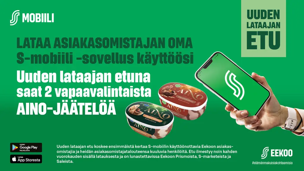 Uuden lataajan etuna saat kaksi vapaavalintaista AINO-jäätelöä.Uuden lataajan etu koskee ensimmäistä kertaa S-mobiilin käyttöönottavia Eekoon asiakasomistajia ja heidän asiakasomistajatalouteensa kuuluvia henkilöitä.Etu ilmestyy noin kahden vuorokauden sisällä latauksesta ja on lunastettavissa Eekoon Prismoista, S-marketeista ja Saleista.