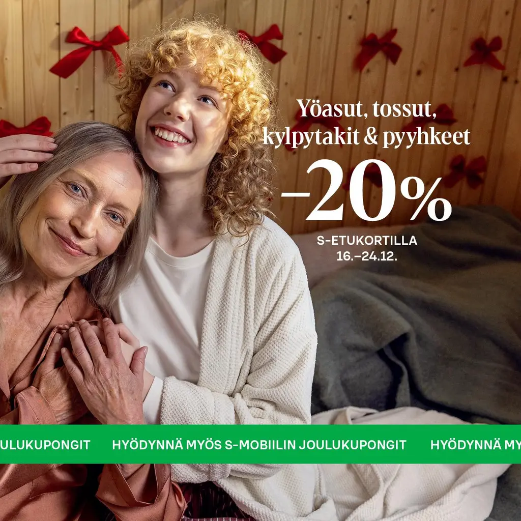 Vielä ehdit hankkia joulun ihanimmat pehmeät paketit. Suloinen yöpaita, ruutupyjama tai mukavat tossut ilahduttavat kaikenikäisiä. Laadukkaat pyyhkeet ja kylpytakit ovat myös helppoja ja aina toivottuja lahjoja. Suuntaa siis jouluostoksille Sokokselle ja sokos.fi-verkkokauppaan, sillä 16.–24.12.2025 saat kaikki normaalihintaiset miesten ja naisten yöasut, tossut, kylpytakit ja pyyhkeet S-Etukortilla –20 %.Muista hyödyntää jouluostoksiisi myös S-mobiilin joulukuponkeja!Tilaa lahjat pakettiautomaattiin tai noutopisteeseen. Lue lisää verkkokaupan toimitustavoista: sokos.fi.