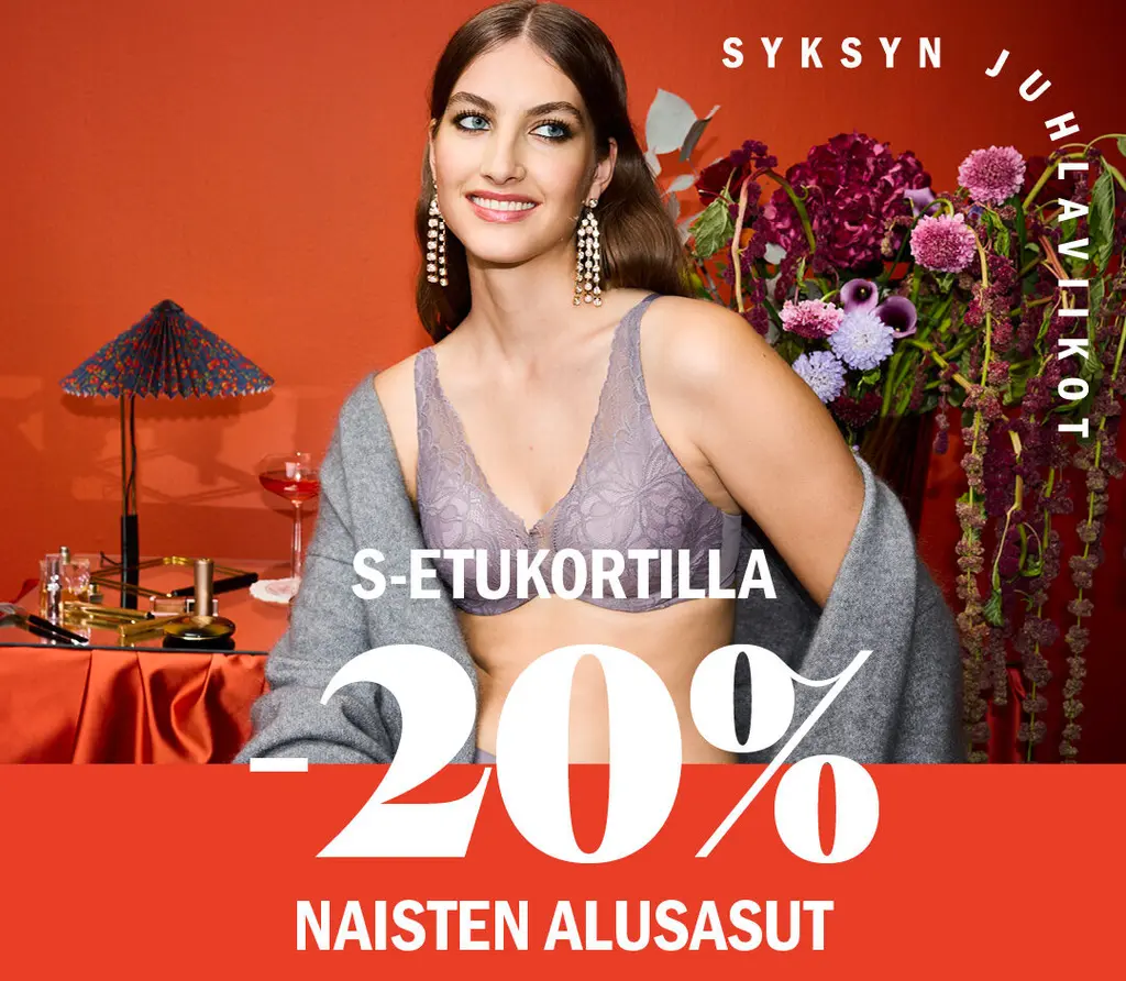 Juhlapukeutuminen alkaa A:sta, eli alusvaatteista.Saat normaalihintaiset naisten alusasut S-Etukortilla –20 % Sokokselta sekä verkkokaupasta sokos.fi. Etu on voimassa 21.–27.10.2024.Etu koskee normaalihintaisia alus- ja yöasuja, uima-asuja sekä aamu- ja kylpytakkeja. ✨