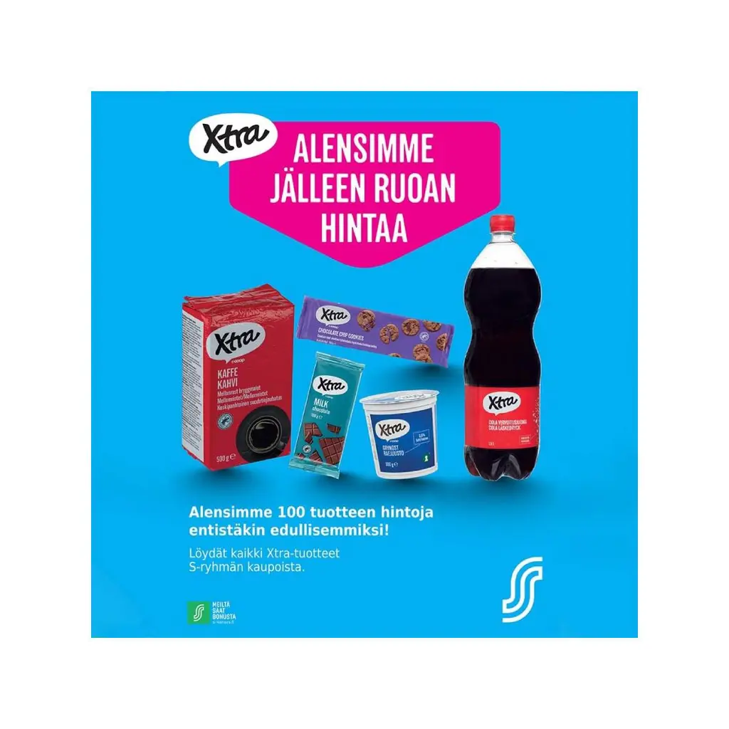 – Meille on tärkeää aktiivisesti edesauttaa sitä, että kaikilla on mahdollisuus syödä hyvin. Siksi laskimme jo maaliskuussa kaikkien Xtra-tuotteiden hintaa ja nyt olemme päättäneet laskea vielä sadan Xtra-tuotteen hintaa entistäkin edullisemmiksi. Keväällä tehtyjen Xtra-tuotteiden hintojen alennukset ovat voimassa ainakin vuoden loppuun asti, kertoo S-ryhmän päivittäistavarakaupan johtaja Sampo Päällysaho.Nyt lasketaan noin sadan suositun arjen tuotteen hintaa: juustoja, rahkoja, jauhoja, hiutaleita, myslejä, säilykkeitä ja hygieniatuotteita. Mukana on monia asiakkaiden suosikkituotteita kuten Xtra-raejuusto, Xtra-vessapaperi ja Xtra-suklaa. Alennukset tehdään kevään hintojenlaskun päälle ja tuotekohtainen hintojen lasku vaihtelee muutamasta prosentista 20 prosenttiin. Näiden tuotteiden osalta keskimääräinen hinnanlasku on lähes 10 prosenttia, kun verrataan hinnanalennuksia maaliskuun hintoihin. Valikoima vaihtelee ketjuittain ja myymälän koon mukaan.– S-ryhmän omien merkkien ja oman tuonnin osuus on noin viidesosa kokonaismyynnistämme ja osuus on pysynyt melko samana vuosia. Kuitenkin asiakkaidemme kiinnostus edullisempia merkkejä, kuten omia merkkejämme, kohtaan on kasvanut tasaisesti keväästä 2022 ja viimeisen vuoden aikana näemmekin omien merkkien myynnin osuudessa yli yhden prosenttiyksikön kasvun, Päällysaho kertoo.