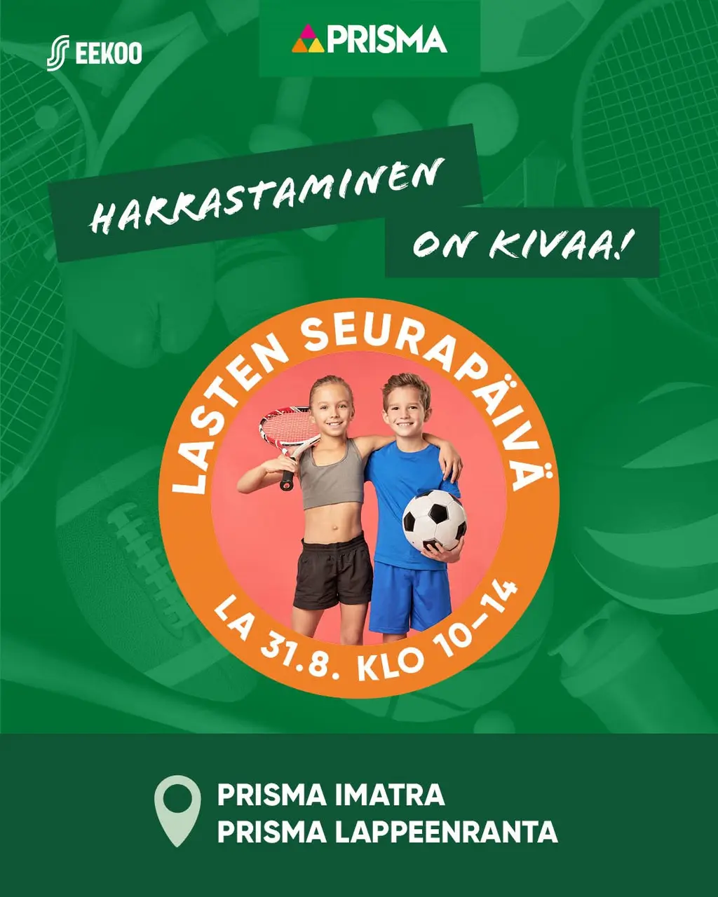 Onko sinun perheessäsi etsinnässä uusi harrastus syksylle tai talvelle? ??????♀️ Eekoon Prismoissa Lappeenrannan Puhakankadulla sekä Imatralla vietetään jälleen Lasten seurapäivää ensi viikon lauantaina 31.8.2024 klo 10-14. Keväällä Lappeenrannan Prismassa järjestetty tapahtuma toteutetaan nyt syksyllä samanaikaisesti myös Imatran Prismalla.⚽️ Seurapäivässä paikalliset urheiluseurat esittelevät omaa toimintaansa ja harrastustarjontaansa. Ohjelmassa on monipuolisia aktiviteetteja lapsille sekä eri lajien väline-esittelyjä ja välinetestausta.? Kaupan puolella lasten pukeutumisen tuotteet sekä palloilutuotteet ovat tapahtumapäivänä-20 % S-Etukortilla.