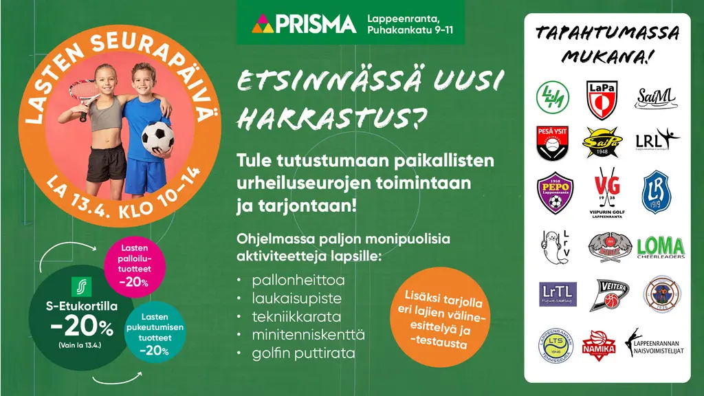 Prisma Lappeenrannan kauppakäytävällä vietetään Lasten Seurapäivää lauantaina 13.4. klo 10-14.Seurapäivässä paikalliset urheiluseurat esittelevät toimintaansa ja tarjontaansa. Ohjelmassa on paljon monipuolisia aktiviteetteja lapsille: koripallon heittoa, laukaisupiste, tekniikkarata, minitenniskenttä, golfin puttirata jne. Lisäksi on tarjolla eri lajien väline-esittelyjä ja välinetestausta.Kaupan puolella on tapahtumapäivänä edullisia erätarjouksia sekä lasten pukeutuminen ja palloilutuotteet -20 % S-etukortilla.Tervetuloa koko perheen voimin mukaan tapahtumaan!