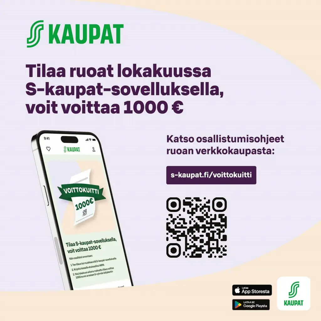 S-kaupoissa on lokakuun ajan käynnissä Voittokuitti -kampanja, jossa on mahdollisuus voittaa 1000€:n arvoinen S-ryhmän lahjakortti. Arvontaan osallistut tekemällä verkkokauppatilauksen S-kaupat-mobiilisovelluksessa ja käyttämällä tilauksen yhteydessä etukoodia ARPA. Arvontaan osallistuminen edellyttää, että tilauksen veloitus tapahtuu lokakuun aikana.Osallistumisohjeet löydät myös osoitteesta: s-kaupat.fi/voittokuitti