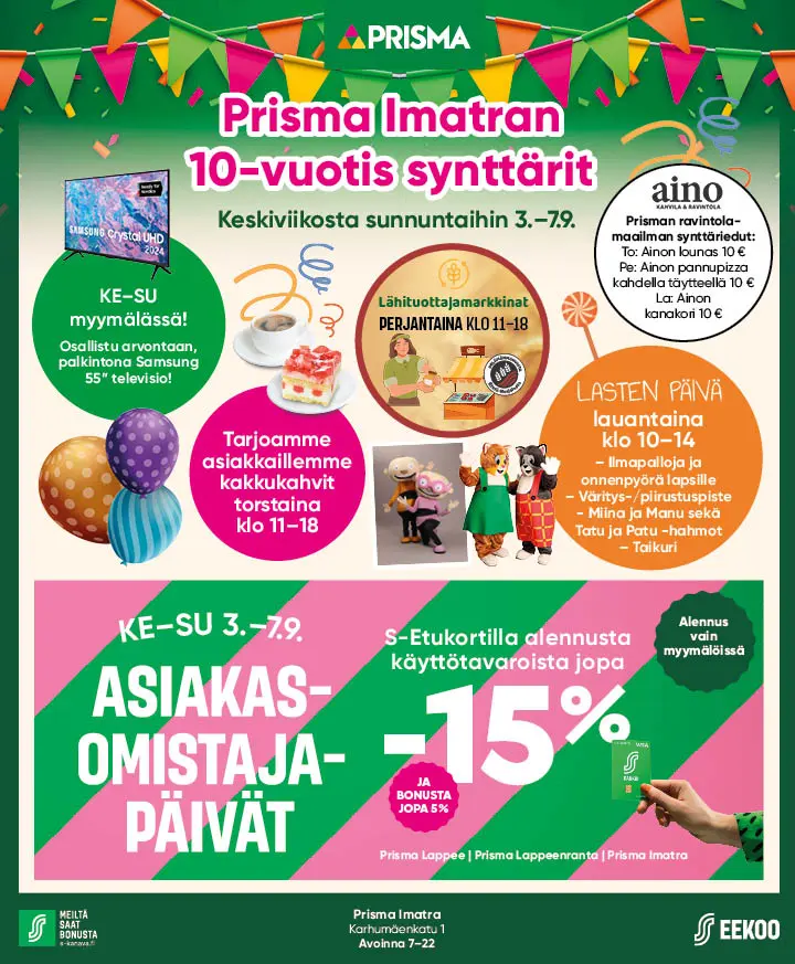 Prisma Imatran 10-vuotissynttäreitä juhlitaan tällä viikolla keskiviikosta sunnuntaihinPrisma Imatran 10-vuotis synttäreitä juhlitaan tällä viikolla keskiviikosta sunnuntaihin.Talo täynnä huikeita synttäritarjouksia!Asiakasomistajapäivät myymälässä keskiviikosta sunnuntaihin S-Etukortilla jopa -15 % alennusta käyttötavaroista (AO-päivät myös Lappeenrannan Prismoissa)Kakkukahvitus torstaina 4.9. kello 11–18 Lähituottajamarkkinat perjantaina 5.9. kello 11–18Lastenpäivä lauantaina 6.9. kello 10–14- Ilmapalloja