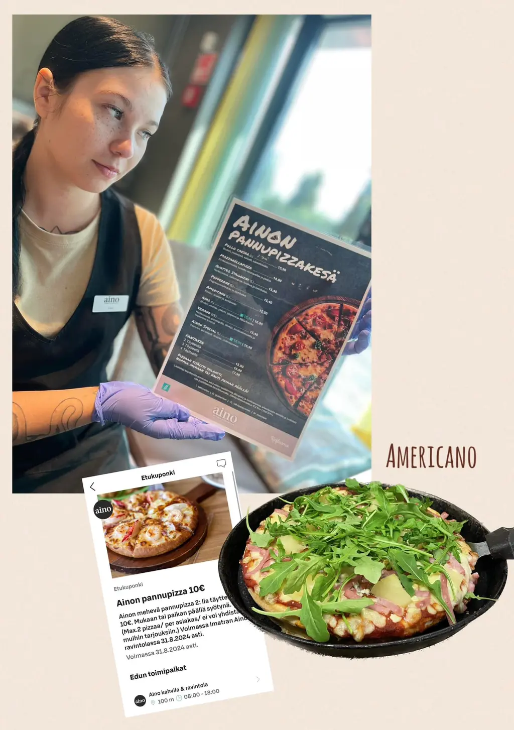 Ikävöitkö pannupizzoja, joita ei enää monestakaan paikkaa saa? Ei hätää, Ainossa vietetään pannupizzakesää!Laajalla listalla on pizzaherkkuja moneen makuun. S-mobiilista löytyy koko kesän ajan kuponki, jolla saat pannupizzan kahdella täytteellä hintaan 10 €.