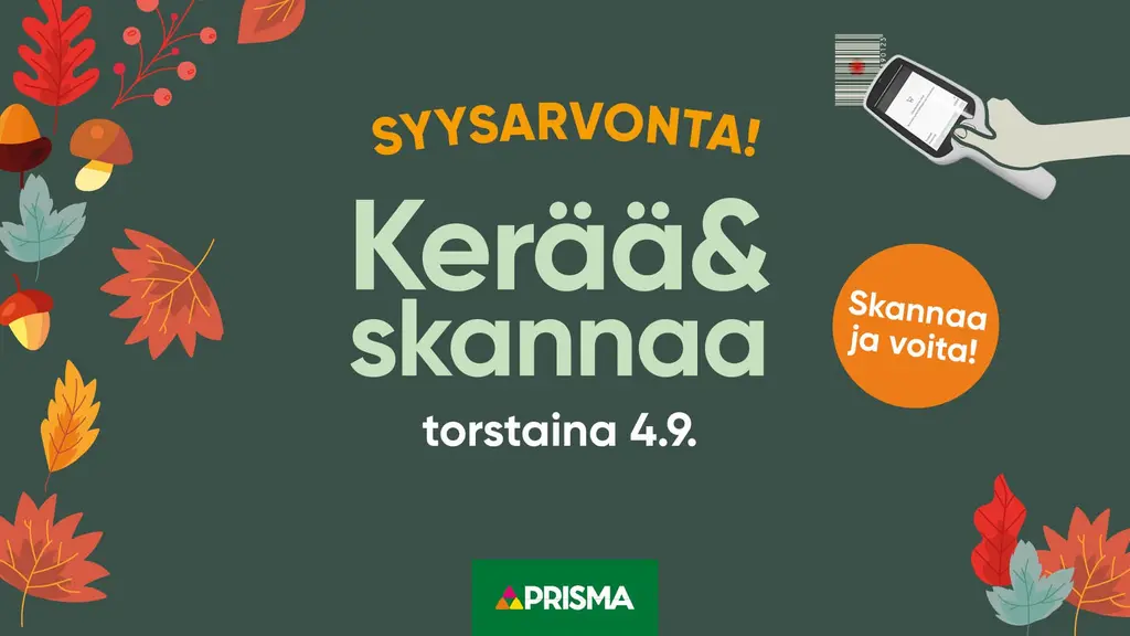 Joko sinä olet testannut ostosreissua nopeuttavaa ja helpottavaa Kerää ja skannaa -palveluamme?Kerää ja skannaa -palvelun käyttäjien kesken järjestetään jälleen torstaina 4.9.2025 klo 7-18 arvonta, jossa voit voittaa ostostesi ohessa syksyisen yllätyspalkinnon. Arvontaan osallistuminen on yksinkertaista – nappaa ostoksille tullessa vain skanneri matkaan ja olet mukana.Satunnaiset Kerää ja skannaa-skannerit ovat merkittynä voittolapulla. Jos laite irroittaa merkatun skannerin sinulle, olet onnekas voittaja. Palkinnon voit noutaa tällöin joko Prisman infopisteestä tai kassahenkilöstöltä. Arvonta järjestetään kaikissa Eekoon Prismoissa.Tervetuloa skanneriostoksille Eekoon Prismoihin, Imatralle ja Lappeenrantaan!
