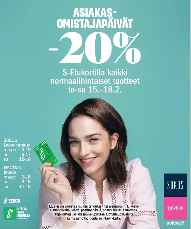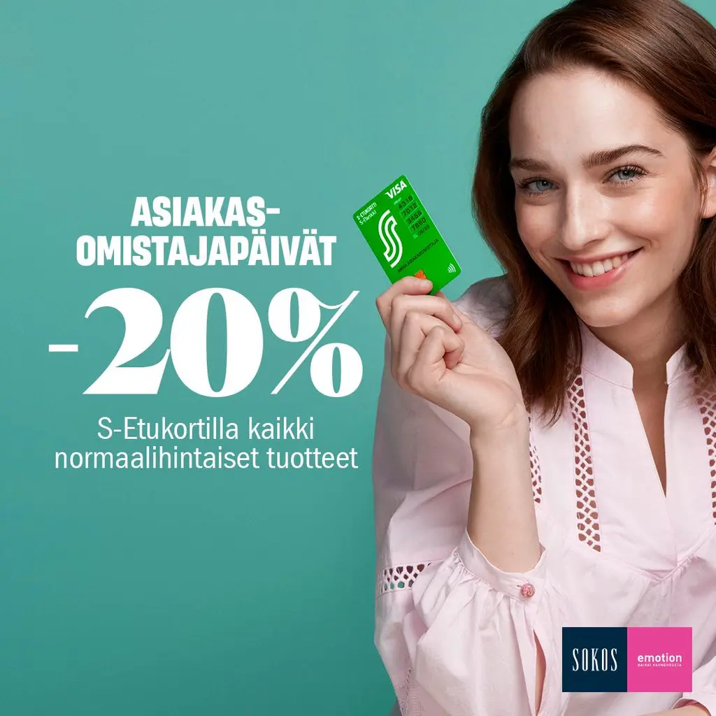 Sokoksella ja Emotionissa AO-päivät to-su 15.2-18.2.2024. Kaikki normaalihintaiset tuotteet –20% S-etukortilla.Etua ei voi yhdistää muihin tarjouksiin tai alennuksiin. Ei koske elintarvikkeita, lehtiä, postimerkkejä, postimerkillisiä tuotteita, lahjakortteja, asiakaspalvelupisteen tuotteita, palveluita,kampaamoita, luontaiselintarvikkeita.