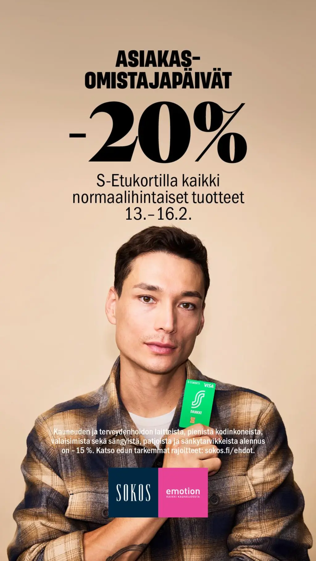 Lähes kaikki normaalihintaiset tuotteet S-etukortilla -20% torstaista sunnuntaihin 13.–16.2.2025 Sokokosella, Emotionissa ja verkkokaupassa