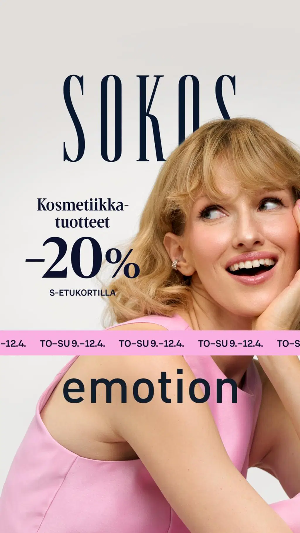 Juhlan kunniaksi saat S-etukortilla -20 % normaalihintaisista kosmetiikkatuotteista Sokos Emotionissa, Sokoksella ja verkkokaupassa sokos.fi.Etu ei koske palvelutuotteita eikä lahjakortteja. Kauneuden ja terveydenhoidon laitteista ja niiden oheistarvikkeista alennus on 15 %.