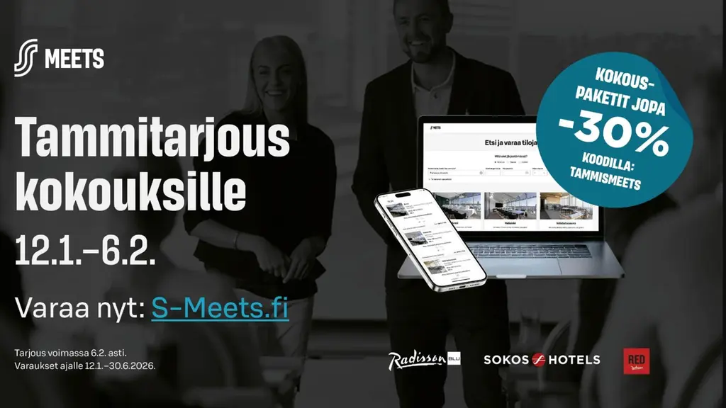 Varaa kokouspaketti S-Meets.fi -palvelussa 12.1.-6.2.2026 välisenä aikana, kokouspaketit jopa –30 % . Kokouksen ajankohdan tulee olla 30.6.2026 mennessä.