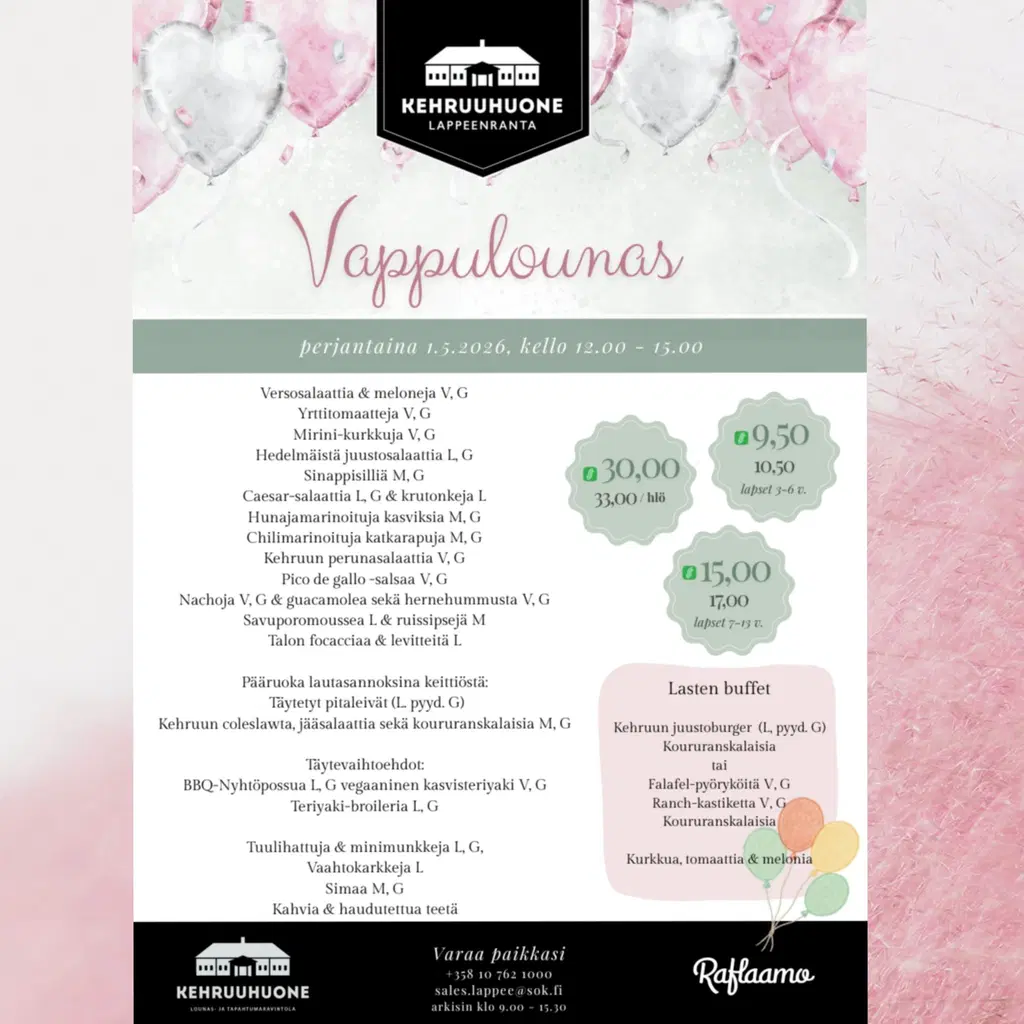 Kehruuhuoneella herkutellaan vappulounasta perjantaina 1.5.2026 klo 12.00–15.00. Alkuruokapöytä sekä jälkiruoat itsepalveluna buffeesta, pääruoka tarjoillaan lautasilla pöytiin.