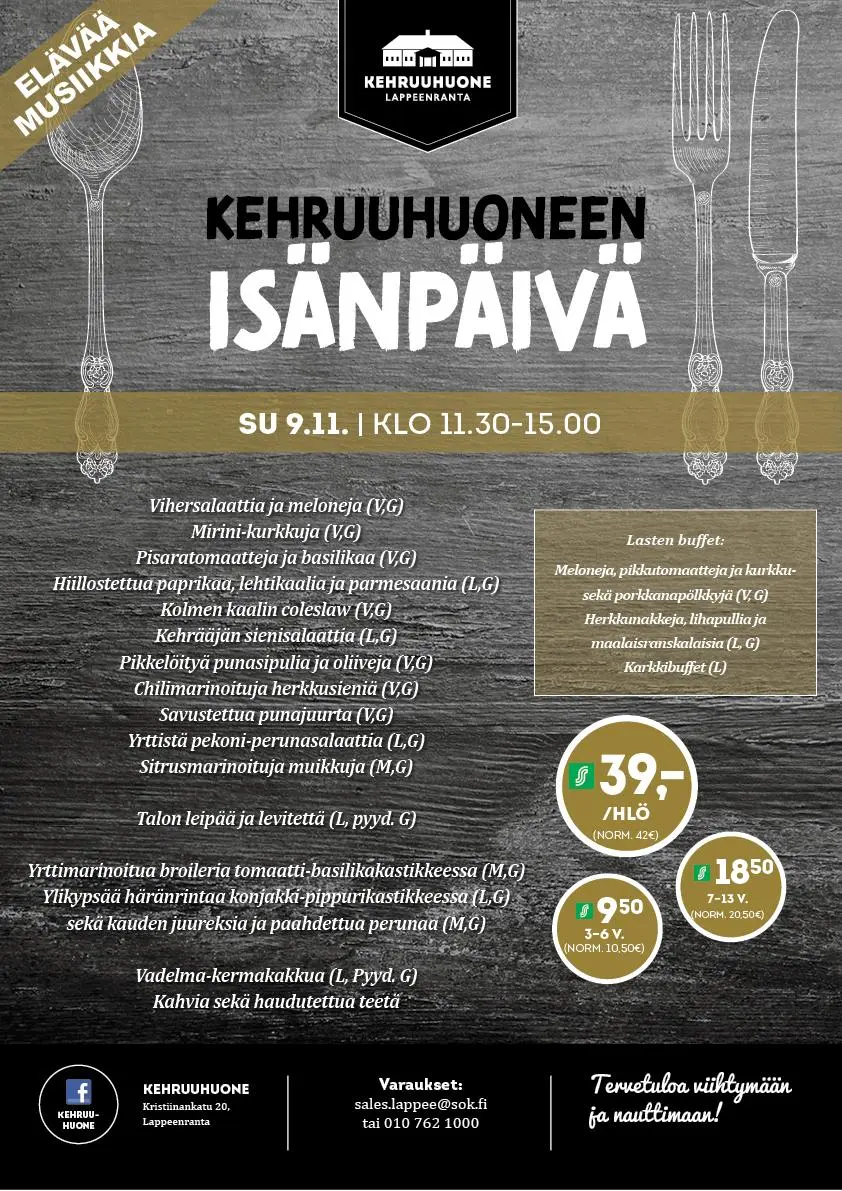 Kehruuhuoneen isänpäivälounas katetaan sunnuntaina 9.11.2025 klo 11.30–15.00.Kehruuhuoneen isänpäivälounas katetaan sunnuntaina 9.11.2025 klo 11.30–15.00. Tarjolla on monipuolinen ja maistuva buffetlounas ja tietysti kakkukahvit. 💚 Aikuiset 39€ (s-etu), 42€ (norm.)💚 7-13-vuotiaat 18,50€ (s-etu), 20,50€ (norm.)💚 3-6-vuotiaat 9,50€ (s-etu) 10,50€ (norm.)Pöytävaraukset myyntipalvelustamme sales.lappee@sok.fi tai p. 010 762 1000.Tervetuloa herkuttelemaan!#kehruuhuone #eekoo #isänpäivä #lounas #elämänmakuisiakohtaamisia #lappeenranta