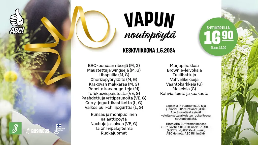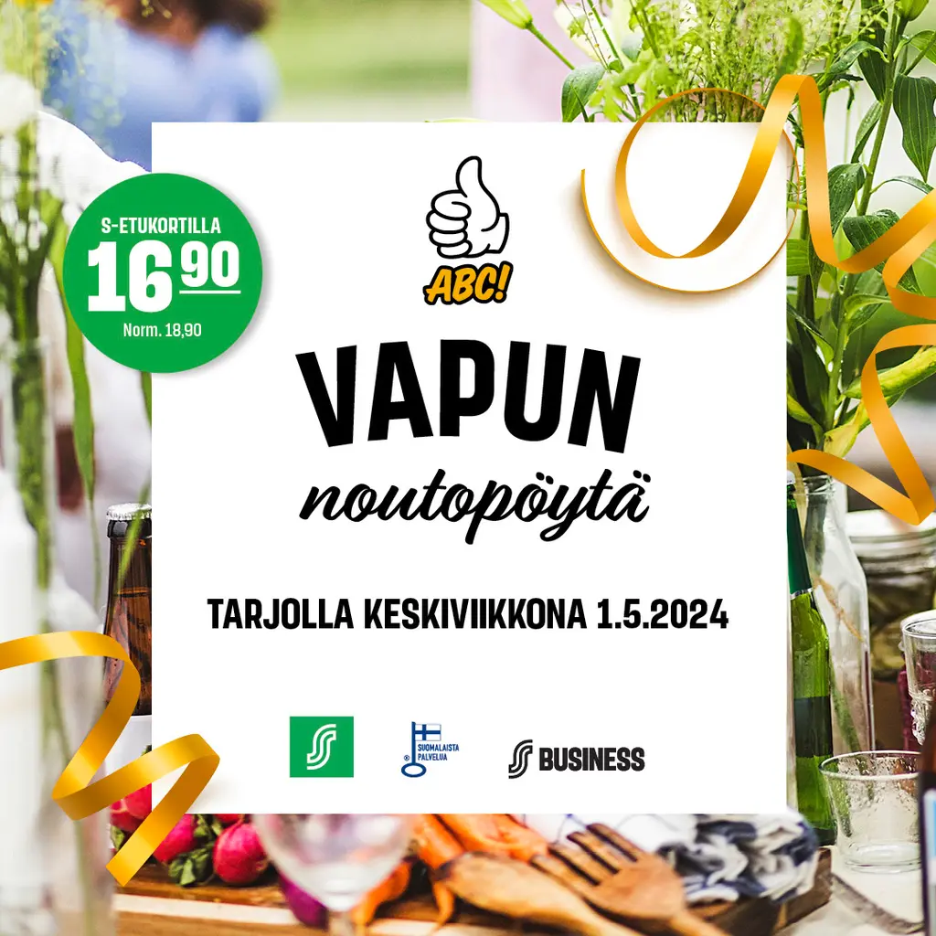 Vapun noutopöytä on tarjolla Eekoon ABC-asemilla keskiviikkona 1.5.2024 hintaan 16,90 € S-Etukortilla, ilman S-etukorttia 18,90 €.Tervetuloa viettämään herkullista vappua ABC:lle!