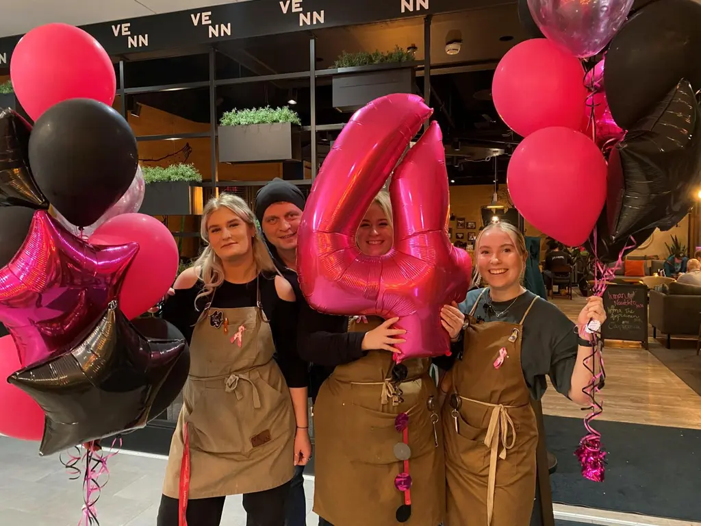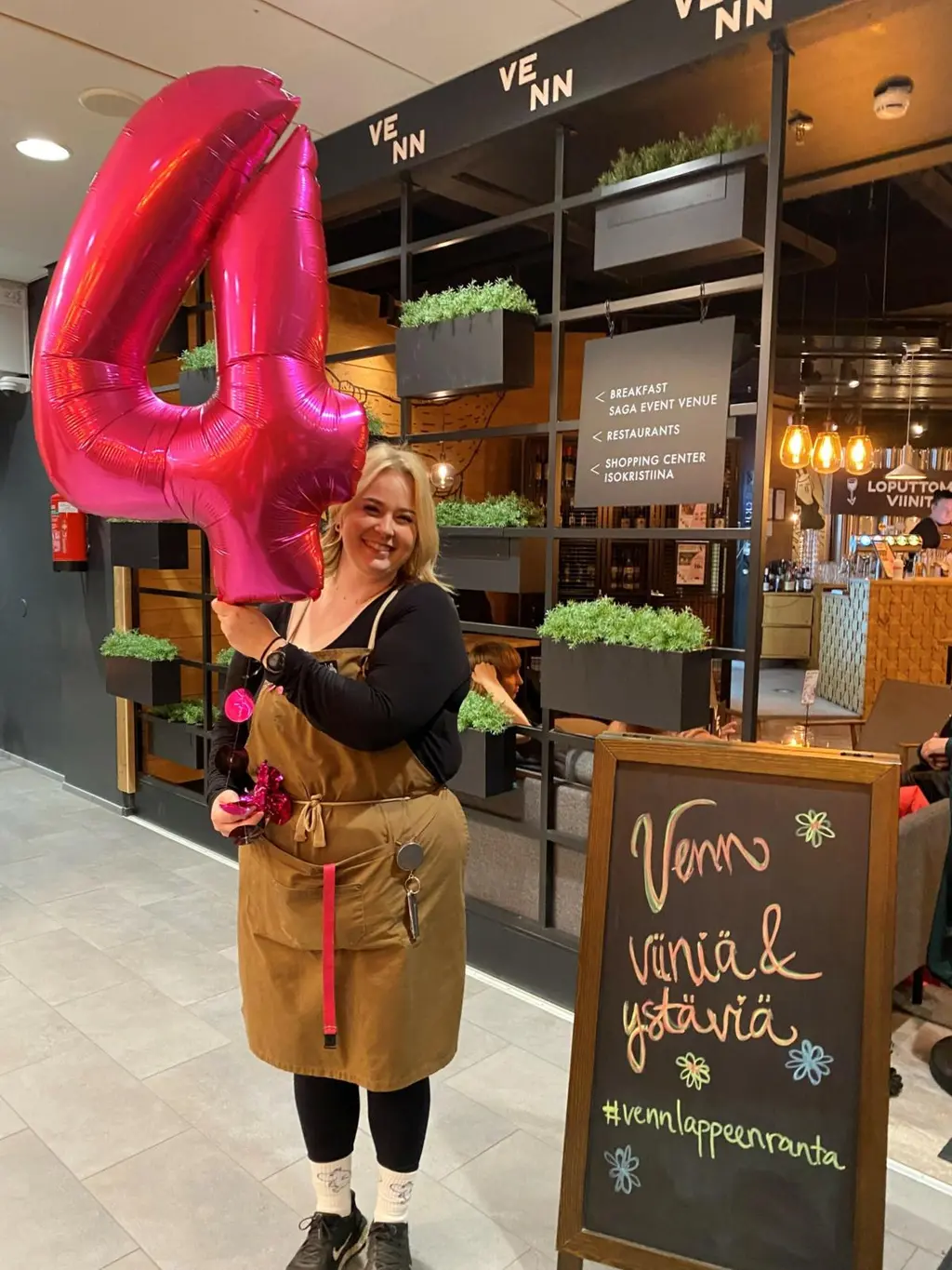 VENN Lappeenranta juhli 15.11.2023 ravintolan 4-vuotis syntymäpäivää. VENNin asiakkaita hemmoteltiin synttärikarkeilla ja juhlabingolla sekä VENNin tyyliin sopivalla rennolla, iloisella fiiliksellä. Kuohuviinipullot poksahtelivat ja nauru sekä puheen sorina kantautuivat VENNistä myöhälle keskiviikkoiltaan. Otimme myös juhlatunnelmista kuvia henkilökunnan kesken, mutta iloksemme innokkaat asiakkaat halusivat myös osaksi synttärikuvia.Tunnelma oli korkealla koko juhlapäivän!Lotta VENNin 4-vuotisjuhlissaKuvassa illan bingoemäntä Viivi ja bingoasiakas Toni – Lempäälästä asti!Kuvassa Viivi, Lotta, Aino sekä asiakkaamme Dmitri
