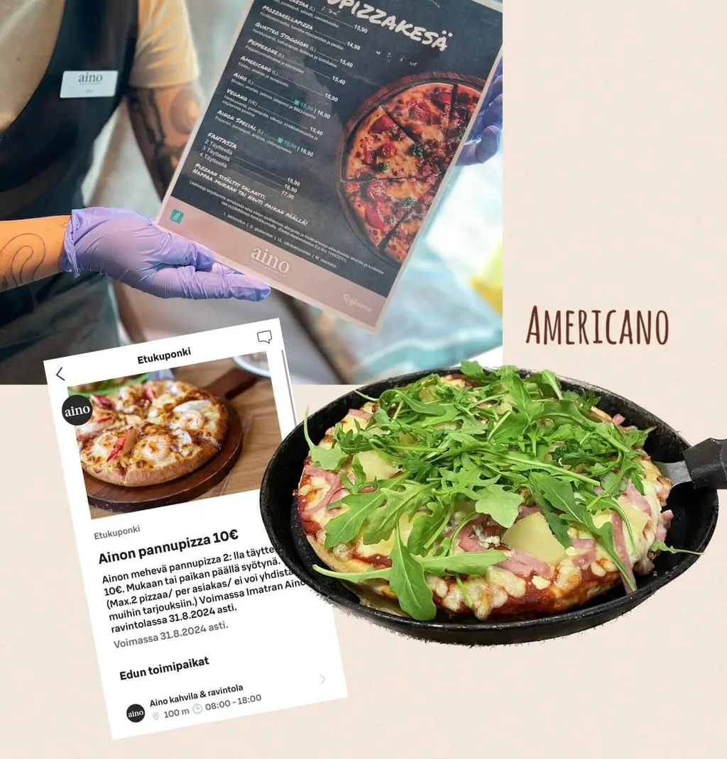 Imatran Ainon elokuun asiakasomistaja-kampanjassa vihreän kortin omistaville kahvi/tee ja herkullinen omenapiirakka hintaan 5,40 €, ilman S-Etukorttia 6,50 €. S-mobiilista löytyy kuponki, jolla saat viilentävän jäälaten hintaan 3 €.Vielä on myös pannupizzakesää jäljellä, S-mobiilin kupongilla kahden täytteen pannupizza vain 10 €! Kannattaa tulla hyödyntämään etu vaikka vähän pidemmältäkin matkalta, koska näitä herkkuja ei monesta paikkaa saa.