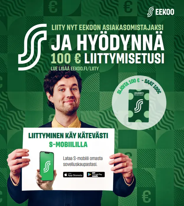 Eekoon osuuskauppavaalit eli edustajiston vaalit käydään ensi vuonna. Edustajisto toimii äänitorvena johdon suuntaan ja huolehtii siitä, että osuuskaupan palveluita ja etuja kehitetään omistajien toiveita kuunnellen.Jotta pääset vaikuttamaan vaaleissa asettumalla ehdolle tai äänestämällä, liity jäseneksi 31.12.2025 mennessä, jos et ole jo jäsen. Liittymisetuna 100e S-ryhmän lahjakortti osuusmaksunsa täyteen maksaneille uusille liittyjille.